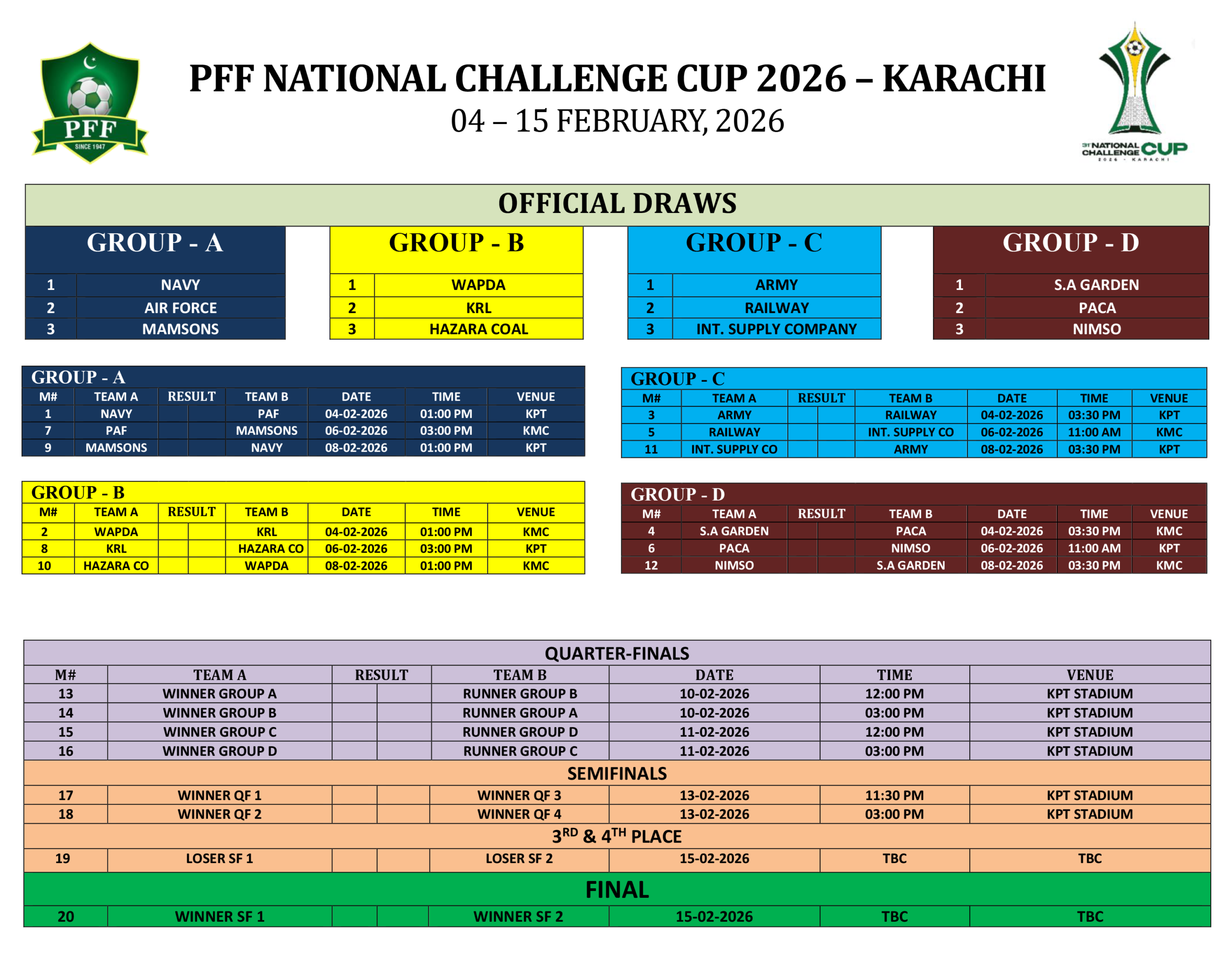 Navy, Pakistan Air Force and Mamsons are in Group ‘A’ while defending champions Wapda headline Group ‘B’ and are alongside KRL and Hazara Coal Company.